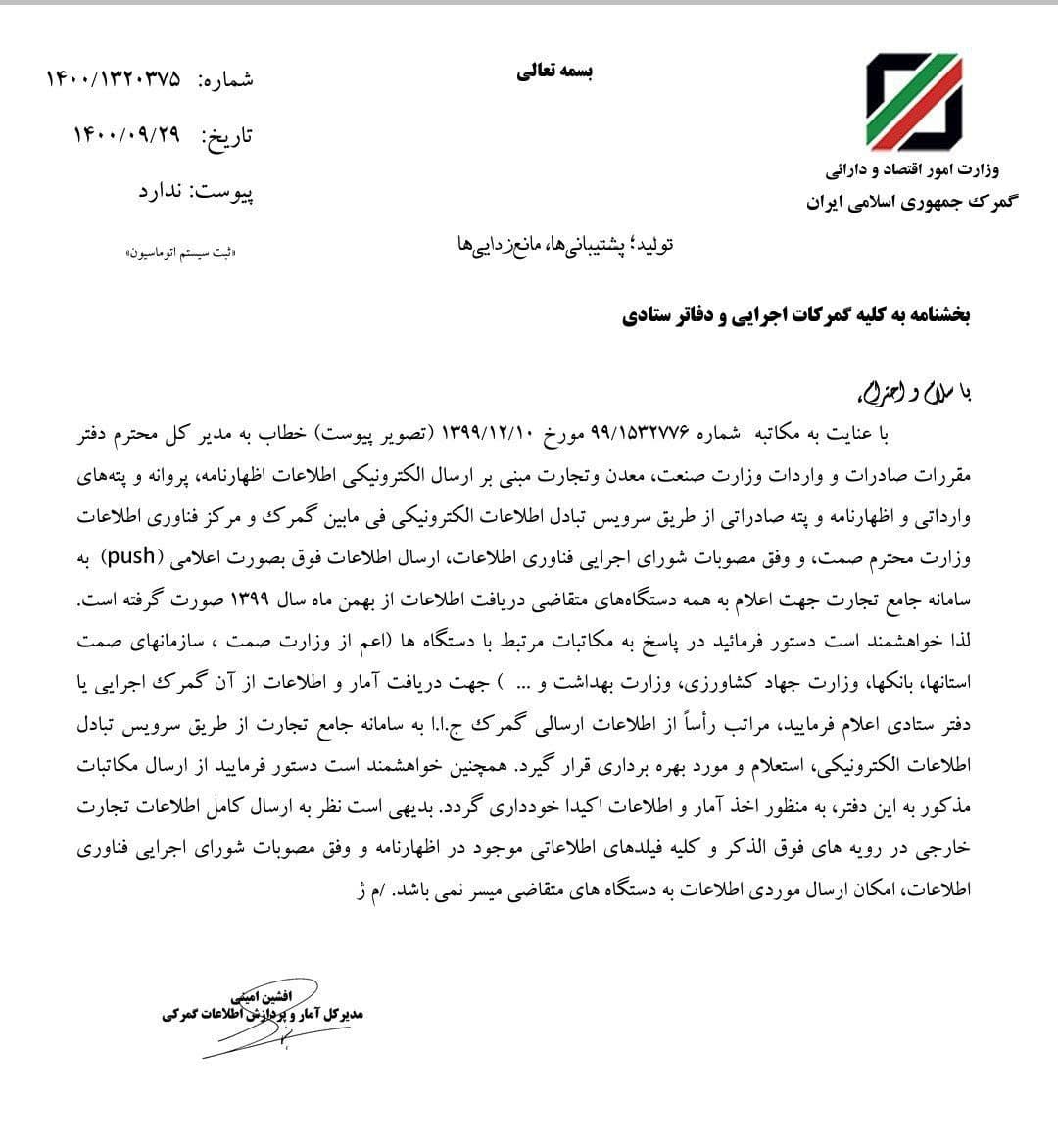 تبادل اطلاعات سامانه جامع امور گمرکی با سامانه جامع تجارت
