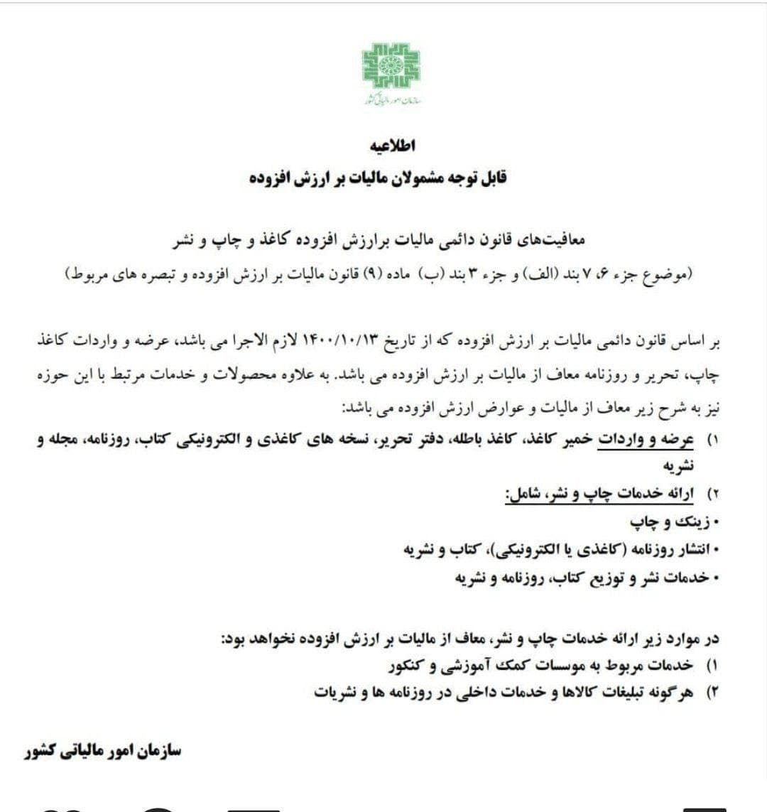 معافیت های قانون دائمی مالیات بر ارزش افزوده مربوط به کاغذ و چاپ و نشر و محصولات و خدمات مرتبط